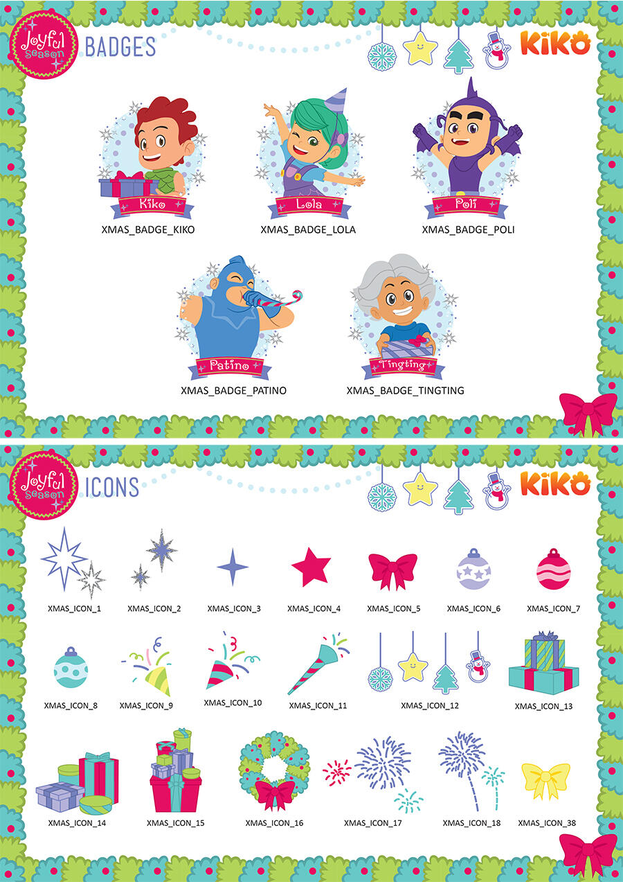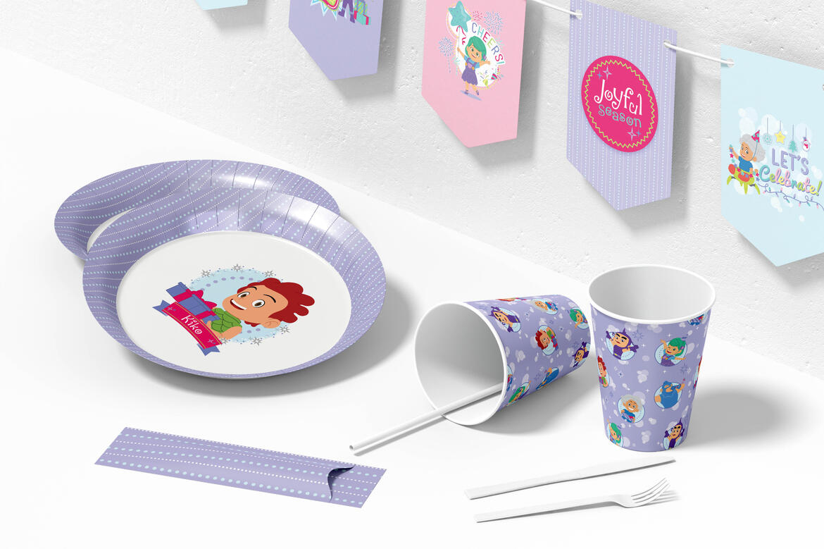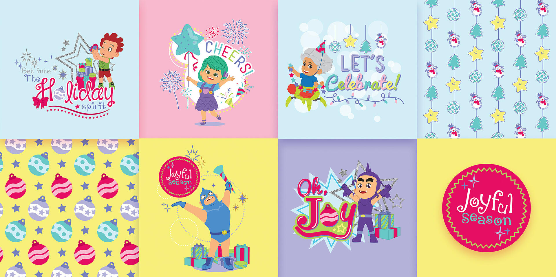 celebration theme with fun activities such as gift-giving and decorating, lots of presents, and ornaments.New poses were added, portraying each character enjoying their holiday party preparation.This seasonal styleguide was developed to fit party kits, decorations, or gift wrapping products.