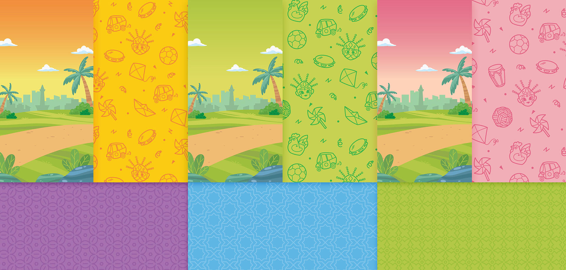 I illustrated some graphic assets for our local IP, Entong mini styleguide. It consists of vector icons, patterns, and environment art.The overall assets take inspiration from the Entong animation series which takes place in Jakarta. We also include some iconic local objects such as bajaj, ondel-ondel, and some traditional games that Entong and friends often play like layangan and sepak takraw.This mini styleguide was developed for our product inspiration focusing in kids' products, especially kids' personal care items.
